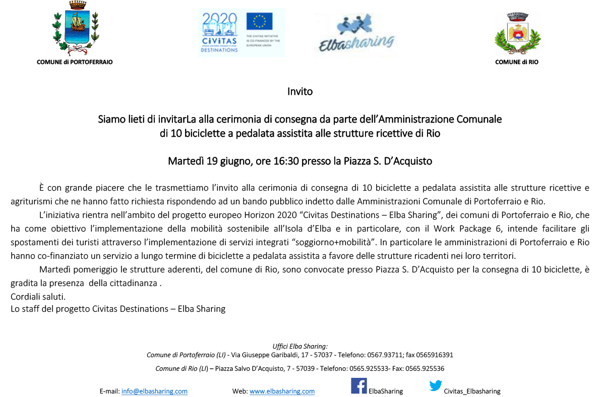È con grande piacere che le trasmettiamo l’invito alla cerimonia di consegna di 10 biciclette a pedalata assistita alle strutture ricettive e agriturismi che ne hanno fatto richiesta rispondendo ad un bando pubblico indetto dalle Amministrazioni Comunale di Portoferraio e Rio.