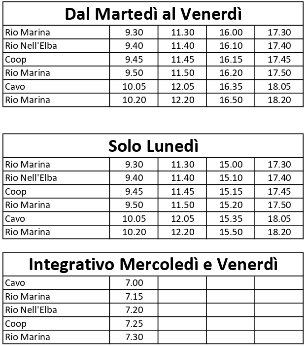 Il servizio è attivo dal lunedì al venerdì nella tratta Rio nell’Elba – Rio Marina – Cavo, agli orari riportati nella tabella seguente: